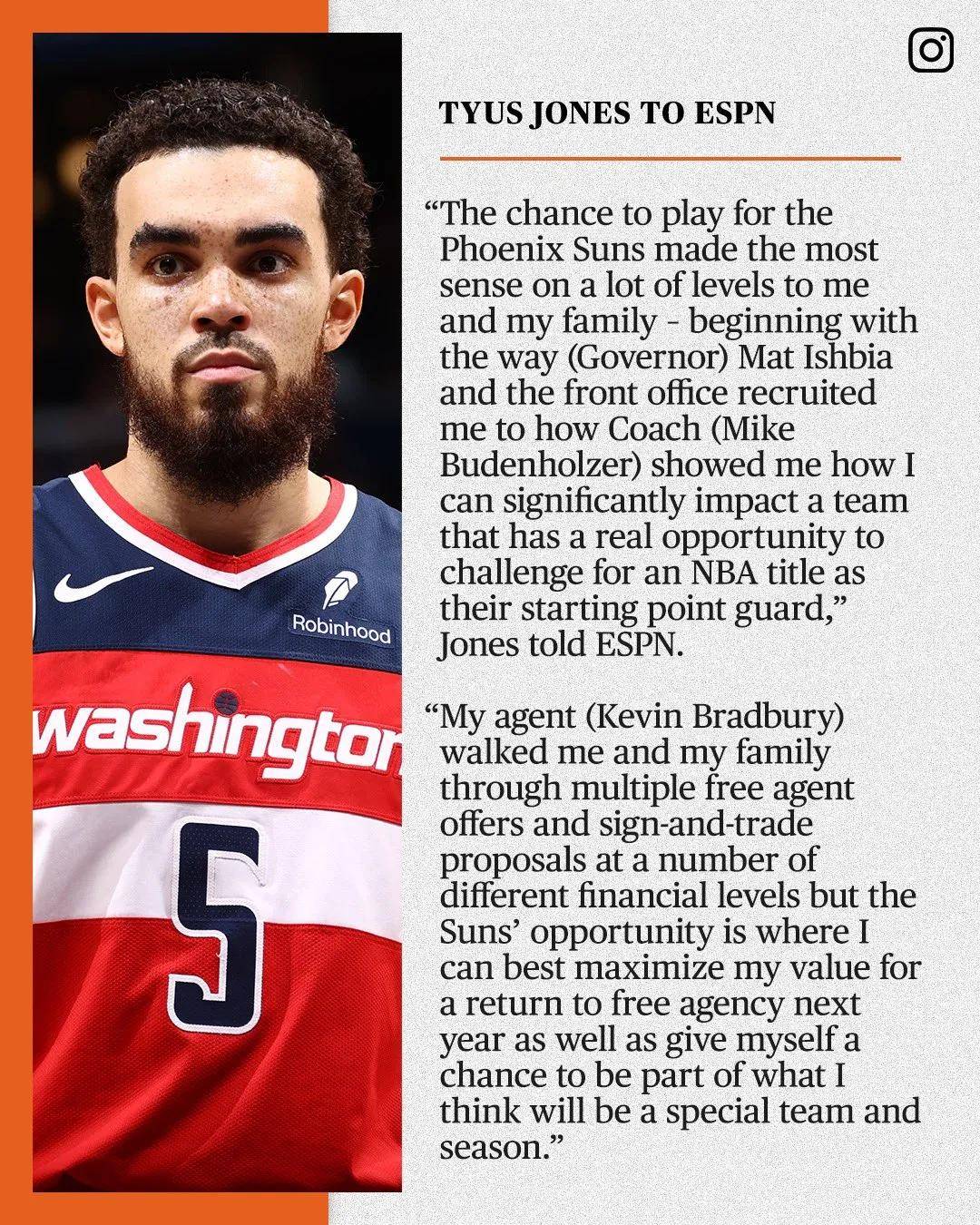 谈到自己选择太阳的理由,琼斯向媒体透露:“太阳老板和总经理亲自招募我,主教练布登霍尔泽向我展示如何打造冠军阵容。我和经纪人考虑了多个报价,太阳这份合同是最适合我的。明年我重返自由市场时,能够冲击大合同。”