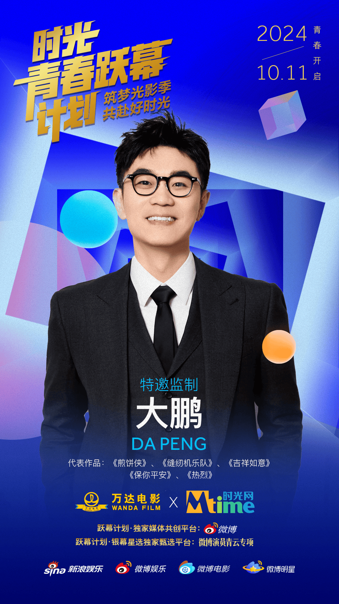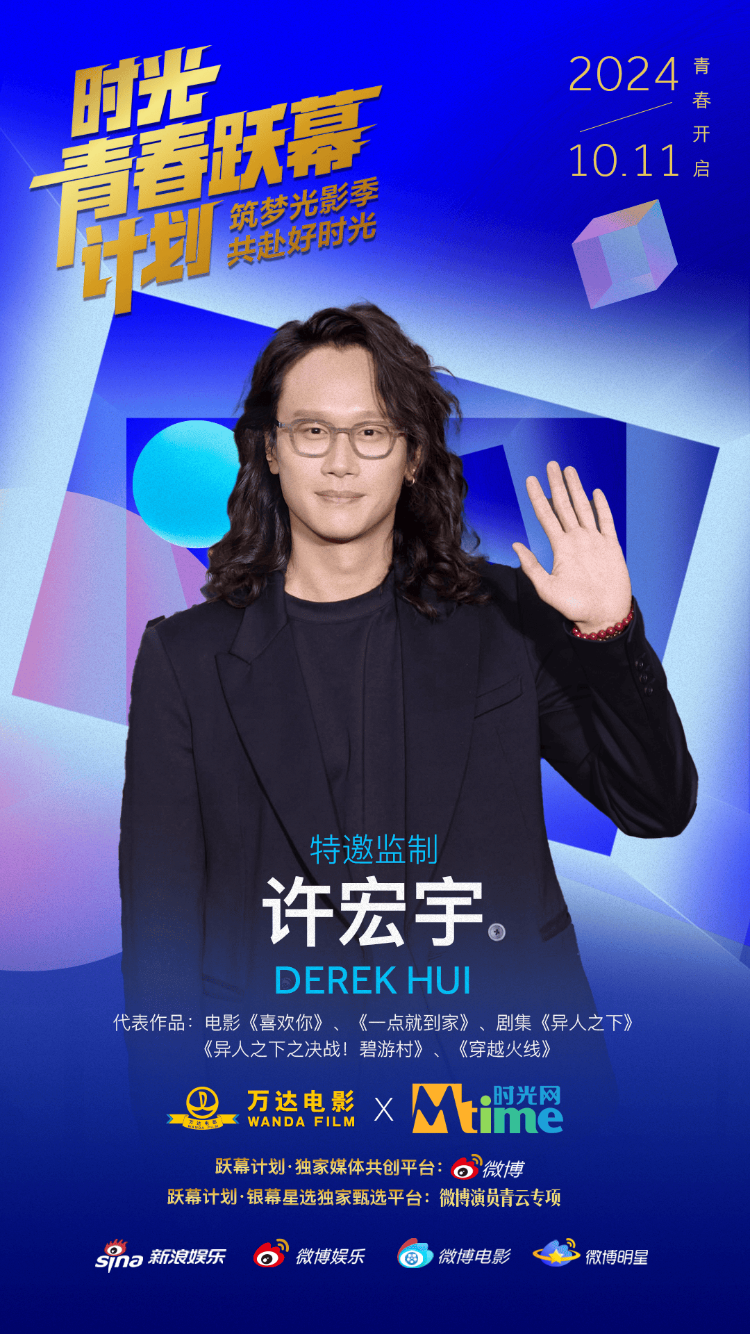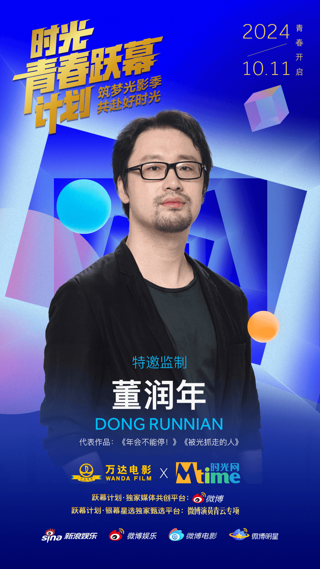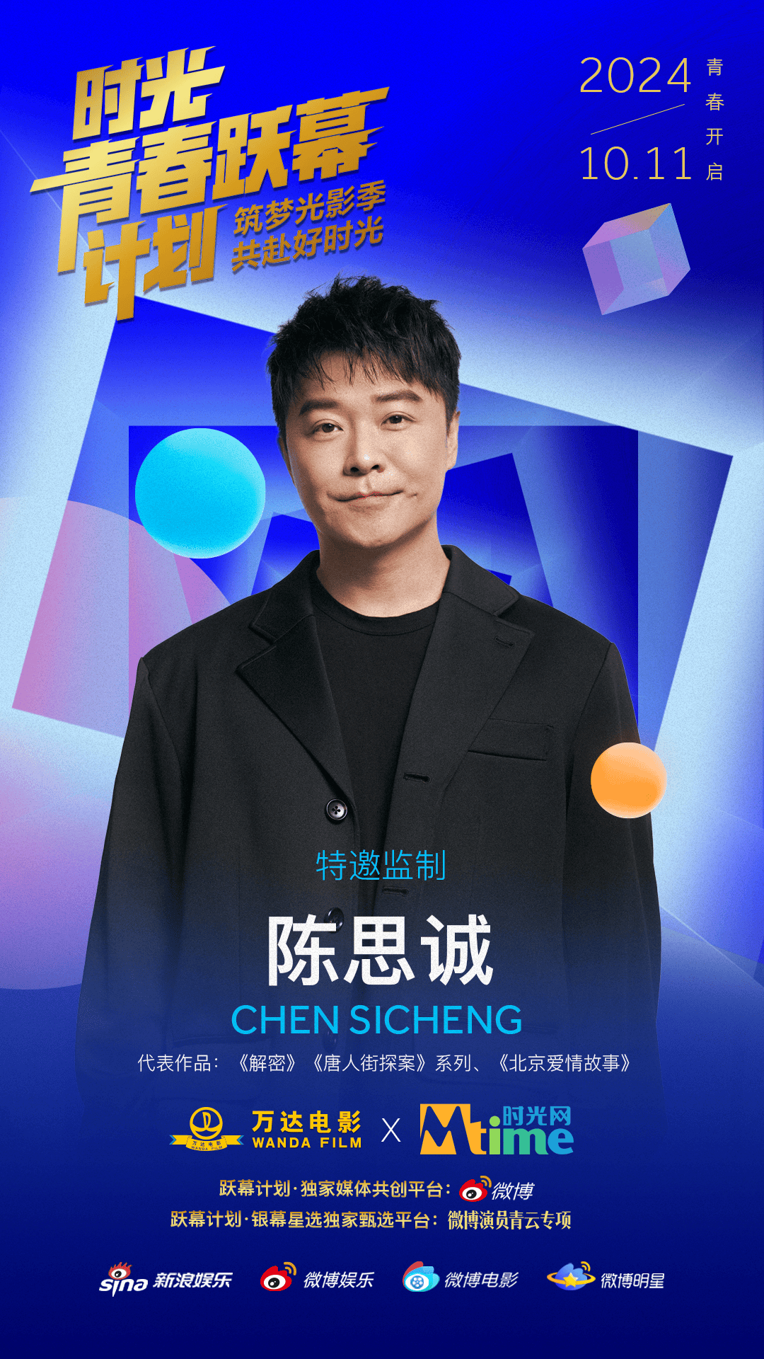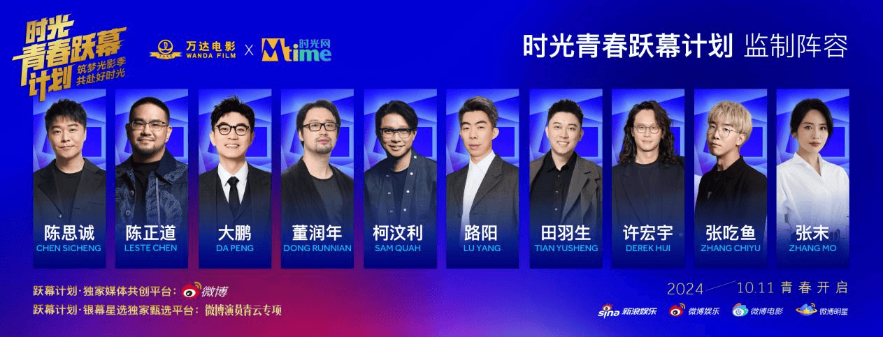 10月11日,万达电影与时光网公布青年电影人扶持计划——“时光青春跃幕计划”的主视觉海报与监制阵容,包括陈思诚、大鹏、陈正道在内的10位著名导演以监制身份加盟。与此同时,该计划在新浪微博和时光网官网开通报名通道,诚邀希望在类型片领域有所建树的青年电影人加入。