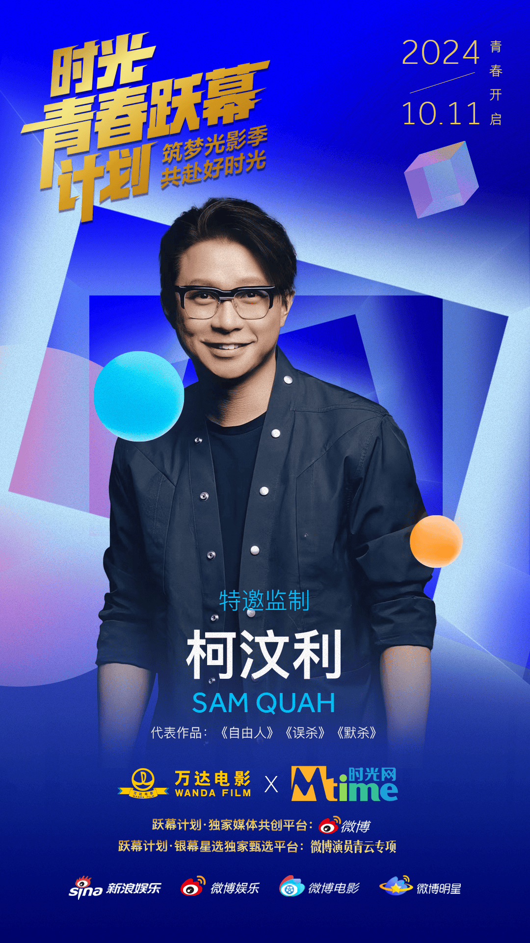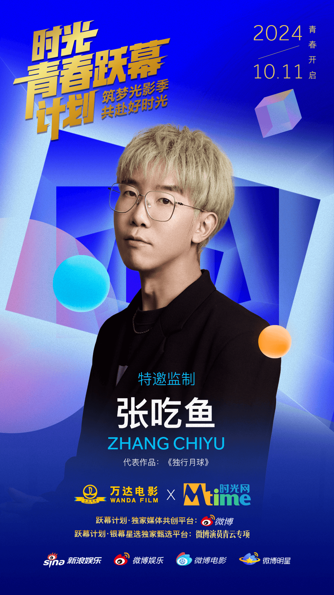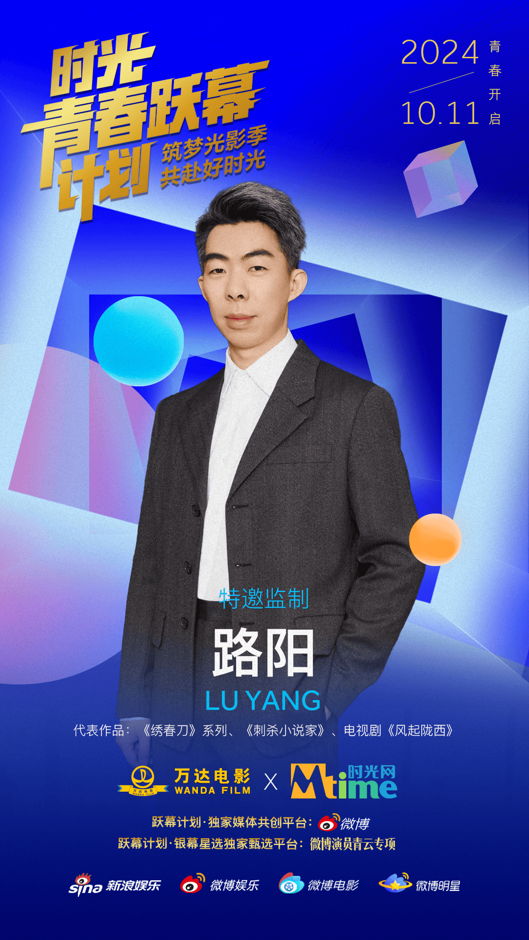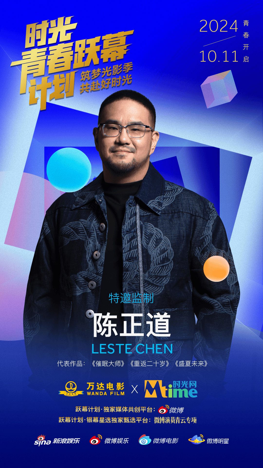 10月11日,万达电影与时光网公布青年电影人扶持计划——“时光青春跃幕计划”的主视觉海报与监制阵容,包括陈思诚、大鹏、陈正道在内的10位著名导演以监制身份加盟。与此同时,该计划在新浪微博和时光网官网开通报名通道,诚邀希望在类型片领域有所建树的青年电影人加入。