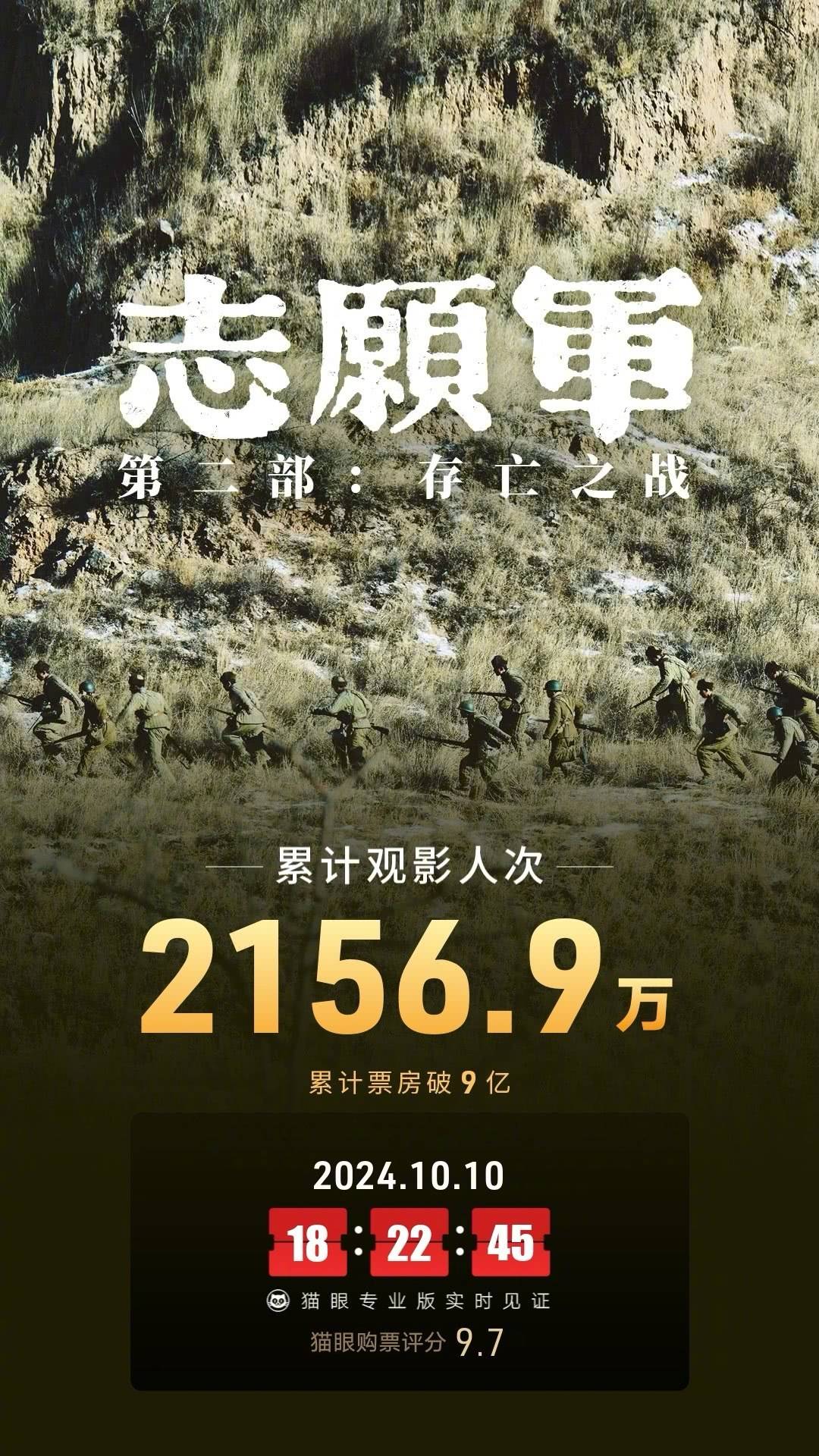 搜狐娱乐讯 据猫眼专业版数据,截至10月10日18:22,陈凯歌执导,朱一龙、辛柏青、张子枫、陈飞宇等主演电影《志愿:军存亡之战》上映11天累计票房破9亿,累计观影人次2156.9万,已超过第一部《志愿军:雄兵出击》的总票房(8.68亿)。
