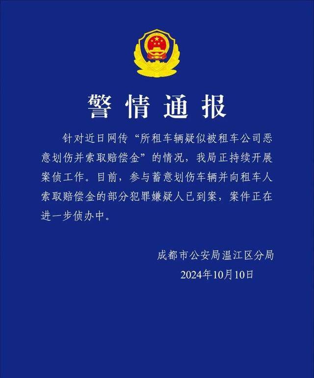 成都市公安局温江分局10月10日通报,针对近日网传“所租车辆疑似被租车公司恶意划伤并索取赔偿金”的情况,该局正持续开展案侦工作。目前,参与蓄意划伤车辆并向租车人索取赔偿金的部分犯罪嫌疑人已到案,案件正在进一步侦办中。