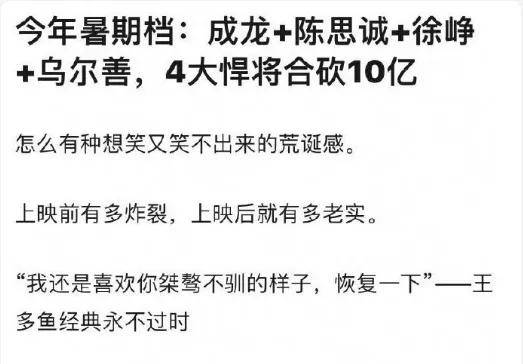 不单是陈思诚,今年暑期档上还流传着“徐峥陈思诚乌尔善成龙凑不到10亿”的声音,曾经是票房保障的导演们集体“失效”,而在冯小刚《非诚勿扰3》遭遇滑铁卢的时候,电影行业就有类似担忧——是时运不济,还是其本身创作理念的“错位”?在探寻疑问的同时,或许我们也能看到电影未来将要面临的境遇。