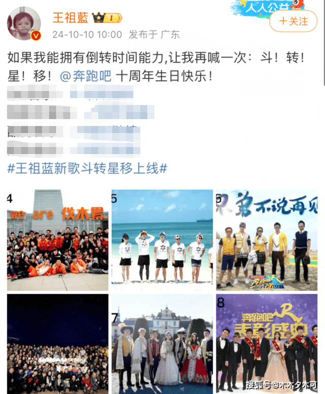 10月10号上午的10点钟,王祖蓝的新歌《斗转星移》正式上线,他还特意发文艾特了奔跑吧官方,原来这首歌是为了致敬《跑男》十周年,从2014年的10月10号到2024年的10月10号,这档综艺节目已经伴随我们十年了。
