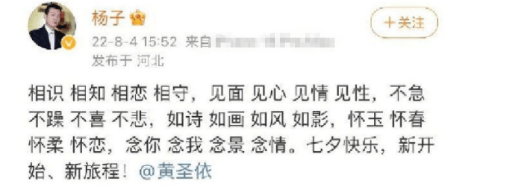 但其实,黄圣依和杨子这一对豪门明星婚姻还真不是第一次突然传出问题。因为之前2022年的情人节,就是黄圣依和杨子两人同一天发动态,结尾的时候提到“新开始,新启程”,引发了两人离婚传闻。