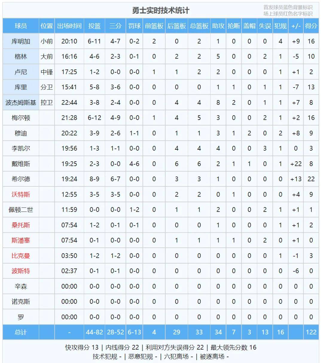 这并不是希尔德勇士首秀,他之前已经打过一场季前赛了。勇士上半场三分球合计27投15中,其中希尔德三分4中4,梅尔顿和库里均是6中3,勇士两个新援太香了。李凯尔上半场打了11分钟,没有投篮出手,得到0分2篮板2助攻。