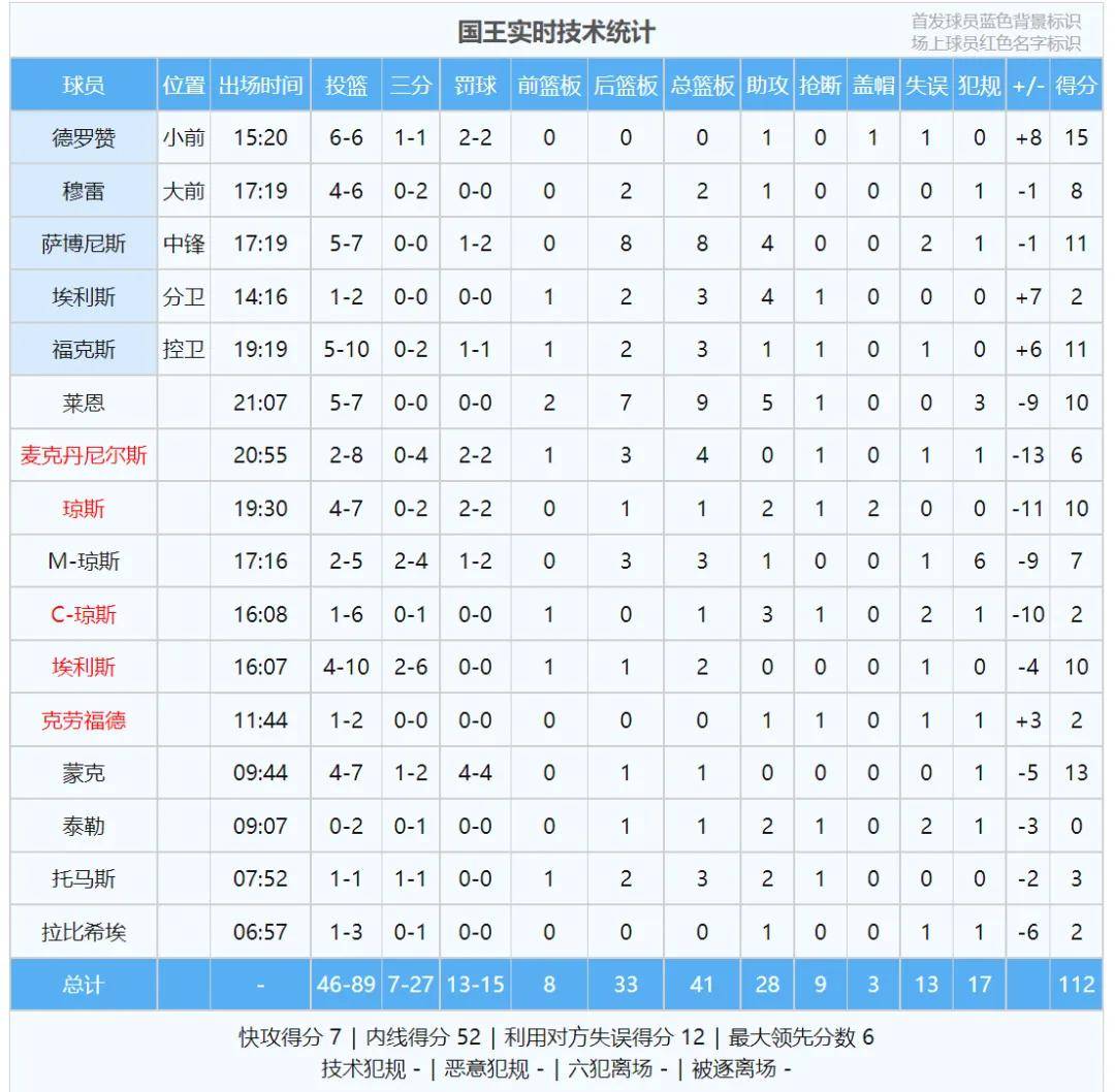 上半场两队展开对攻大战,第一节勇士得到31分,国王队得到27分。第二节勇士轰下35分,已经够猛了,没想到国王单节41分!半场战罢,国王68比66领先勇士。德罗赞首节4中4得到10分,半场6中6独得15分,正负值 8全场最高。