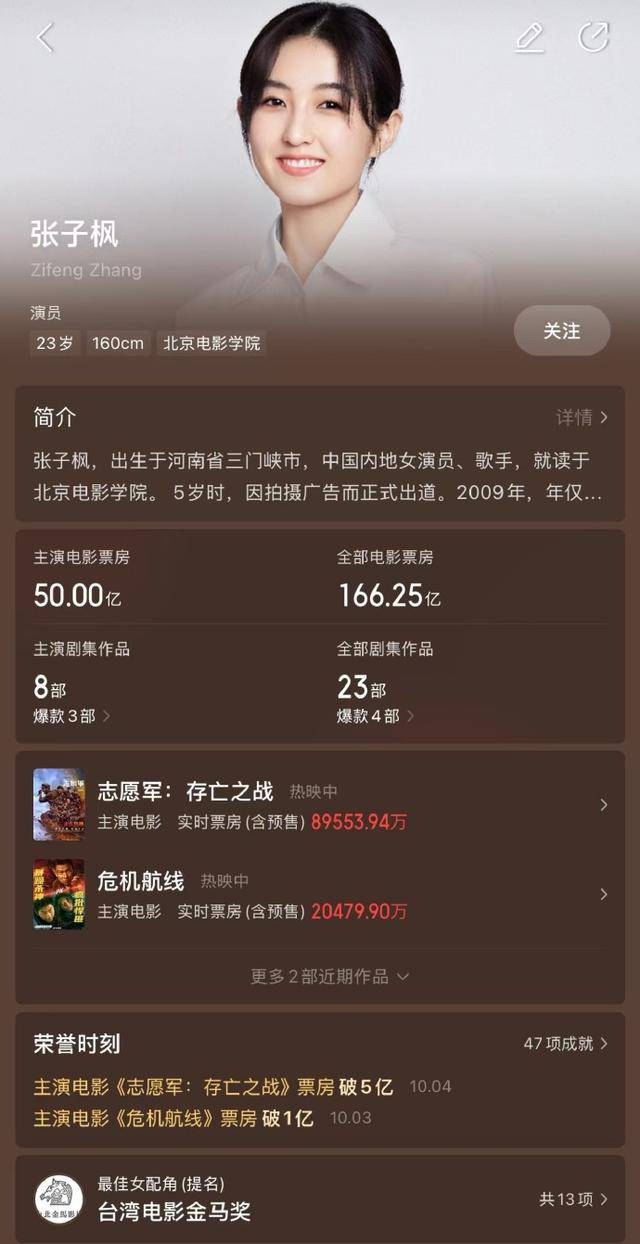 搜狐娱乐讯 10月10日, 据猫眼专业版数据,演员张子枫主演电影累计票房破50亿,其中她参演的《志愿军:存亡之战》《危机航线》的上映于国庆档,《志愿军:存亡之战》更是作为国庆档冠军,获得8亿元票房。