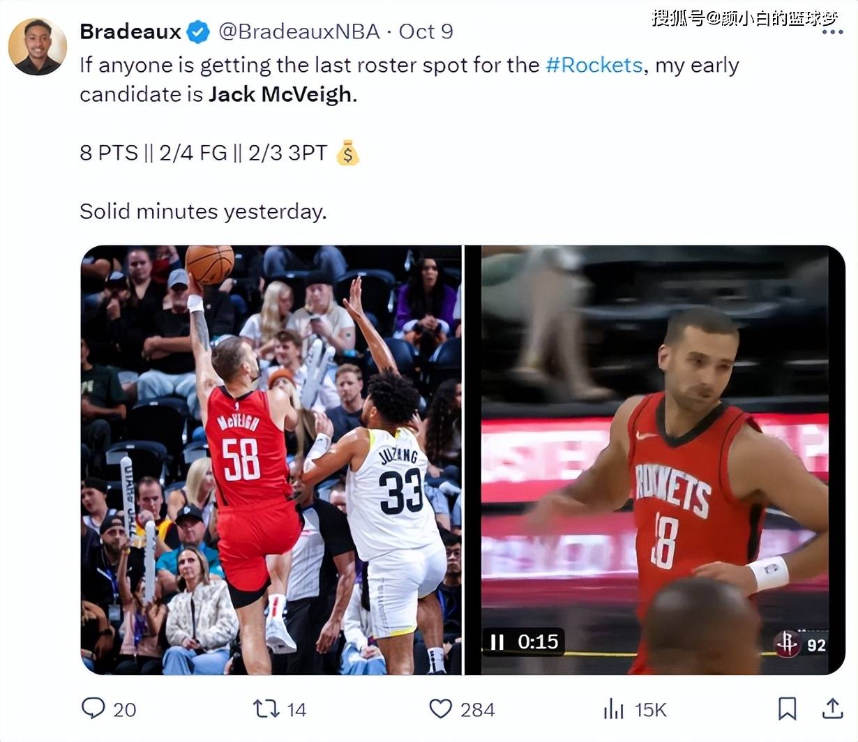 来自NBL的麦克维今年已经28岁,他只是火箭的一个双向合同球员而已,他的能力在G联赛应该随便打一个先发。