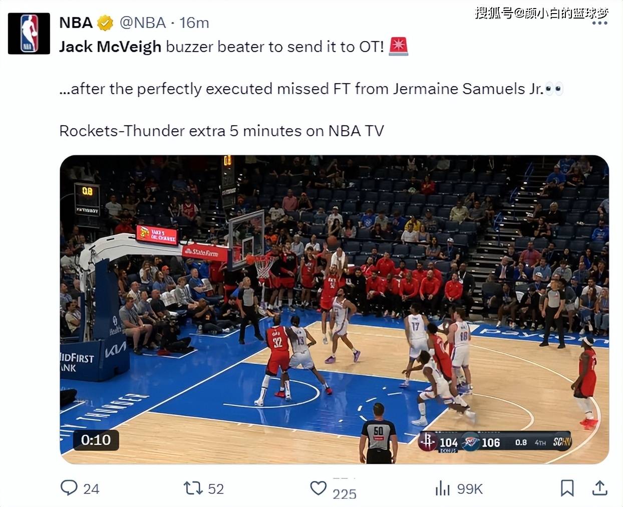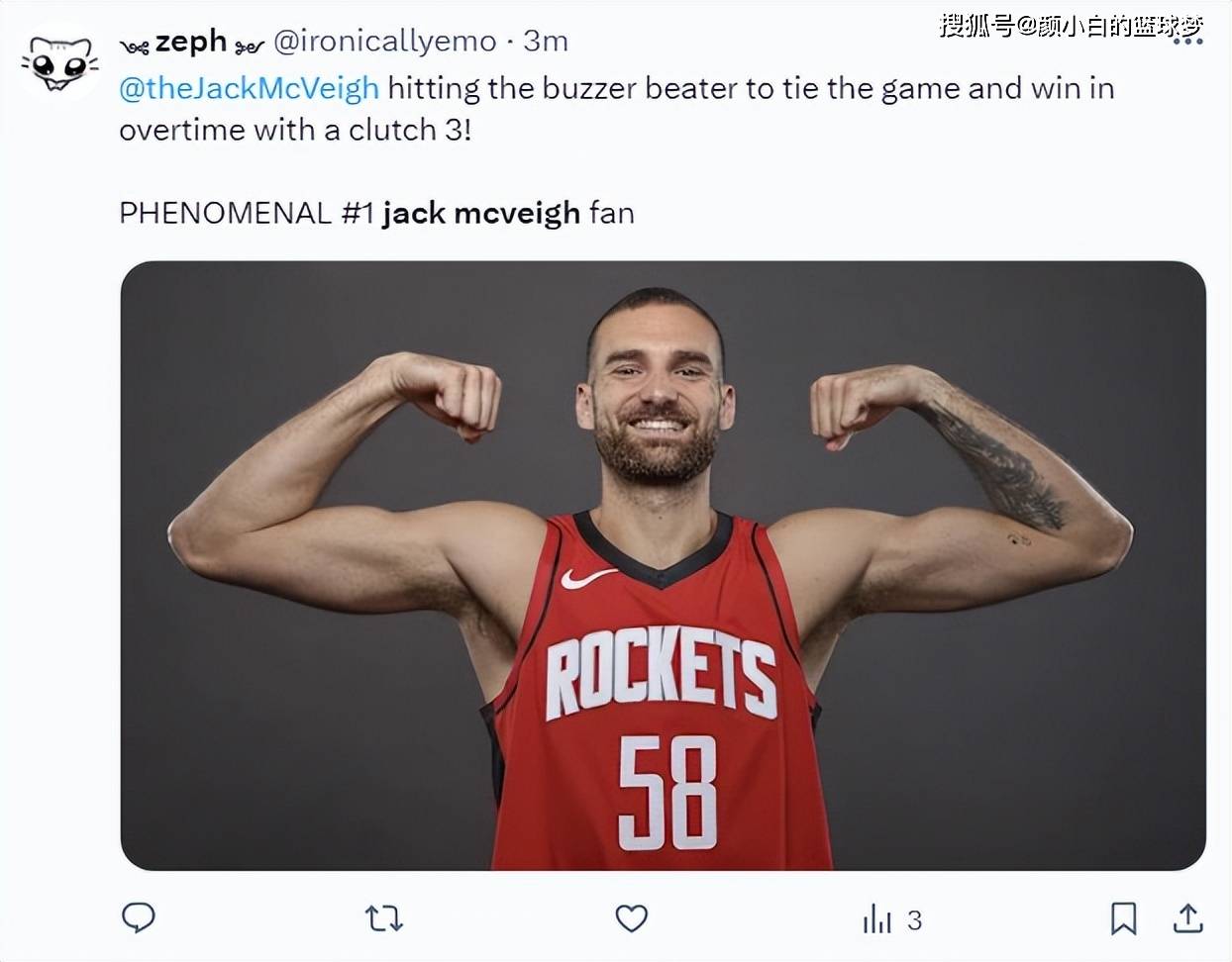 此役麦克维打了7分40秒,4中3,三分2中1,拿到7分4篮板,加时赛的那个三分球直接锁定胜局,有火箭球迷表示自己已经成为了麦克维的忠实粉丝。