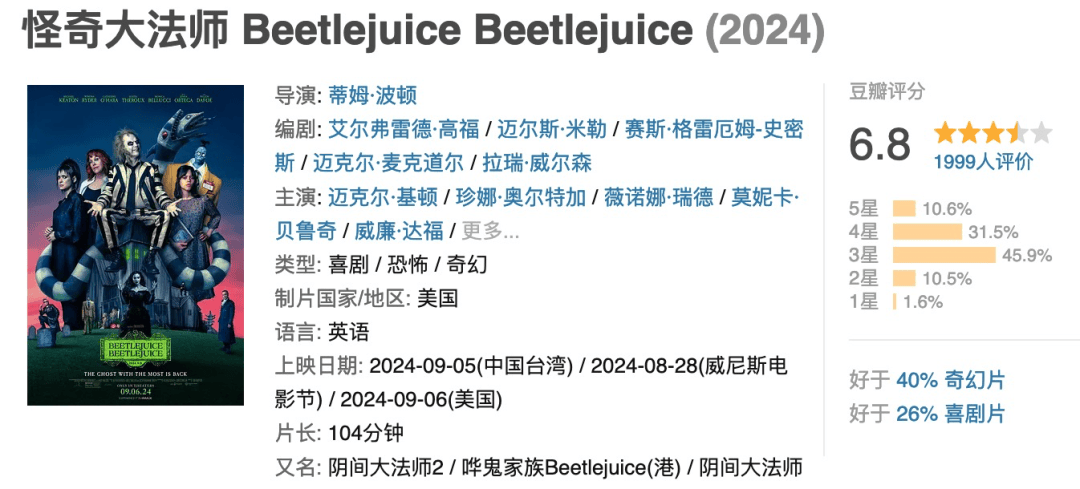 另外,当初的《阴间大法师》叫做 Beetlejuice,如今的《怪奇大法师》叫 Beetlejuice Beetlejuice。