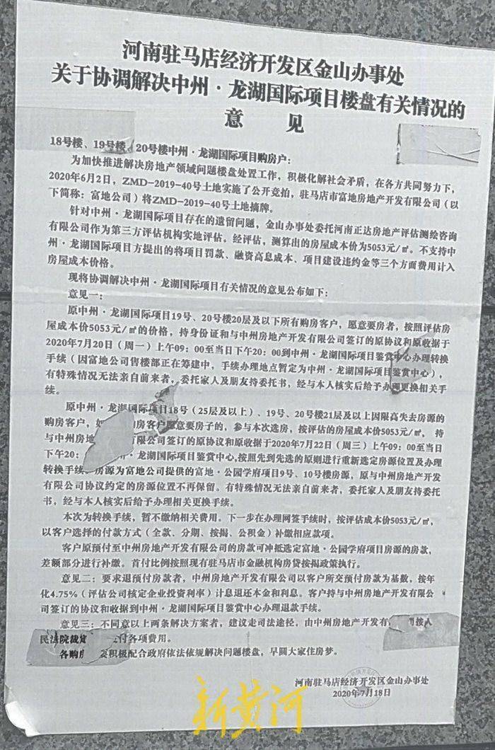在驻马店市经济开发区金山办事处发布的解决意见中,一共分三条。意见一为:原中州·龙湖国际项目19号、20号楼20层(含20层)以下所有购房客户,愿意要房者,按照评估房屋成本价5053元/㎡的价格,办理转换手续;原中州·龙湖国际项目18号(25层及以上)、19号、20号楼21层(含21层)以上因限高失去房源的购房客户,如果原购房客户愿意要房子的,参与本次选房,按评估的房屋成本价5053元/㎡,并可分别于2020年7月20日和22日办理转换手续。意见二为:要求退预付房款者,中州公司以客户所交预付房款为基数,按年化4.75%(评估公司核定企业投资利率)计息退还本金和利息。意见三为:不同意以上两条解决方案者,建议走司法途径。