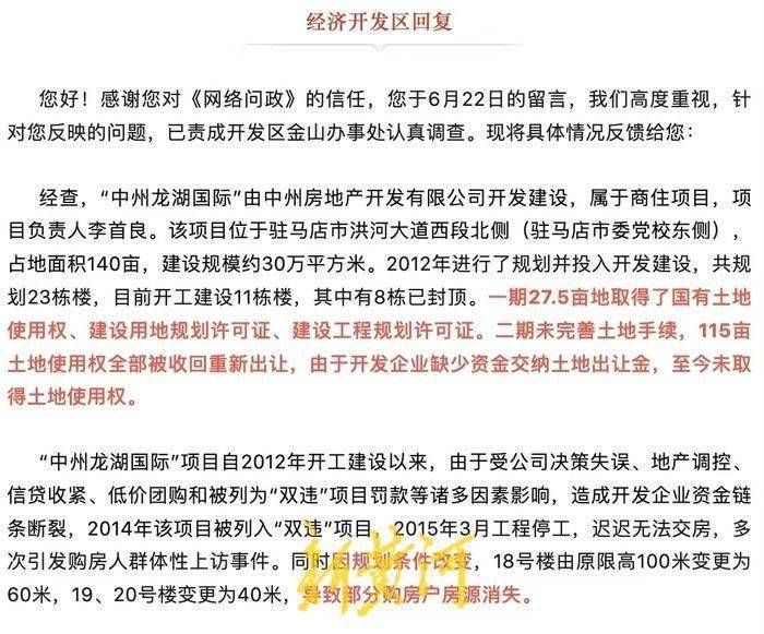 上述回复中还提到,“中州·龙湖国际”项目自2012年开工建设以来,由于受公司决策失误、地产调控、信贷收紧、低价团购和被列为“双违”项目罚款等诸多因素影响,造成开发企业资金链条断裂,2014年该项目被列入“双违”项目,2015年3月工程停工,迟迟无法交房。同时因规划条件改变,18号楼由原限高100米变更为60米,19、20号楼变更为40米,导致部分购房户房源消失。