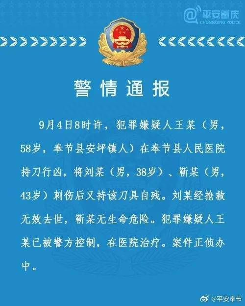 重庆奉节警方通报:男子医院行凶致1死1伤