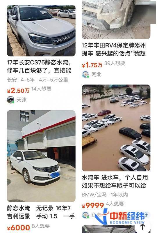 中新经纬以“泡水车”为关键词在某二手平台进行搜索,结果显示,近期有不少出售泡水车和收泡水车的帖子,中新经纬发现,上述帖子的发帖IP多显示在河北、北京、江苏等地,“暴雨”一词频繁出现,最便宜的泡水车甚至只需要数千元就能买到。