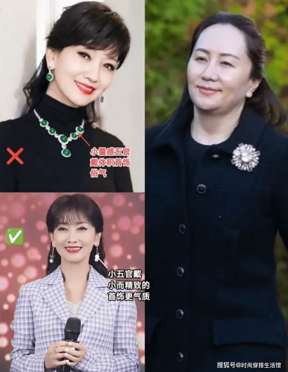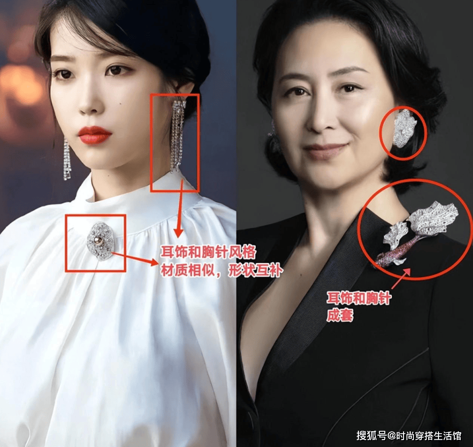 无论耳饰、胸针还是别的单品,关键是要确保与个人的五官和体型相协调,拥有骨架小、五官留白多的特点,更适合佩戴小巧而精致的配饰。孟晚舟体型较为宽大、五官略显钝感的人,则更适合选择体积较大的配饰。