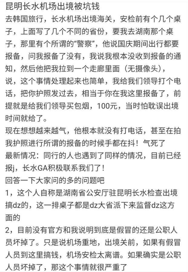 其一,收钱的人到底是什么身份?据了解,官方称是外省公安在机场工作组的行为,到底是不是这样呢?有传言称,涉事人员已暂停在昆明的工作,被带走调查核实。这就需要涉事单位正面回应。