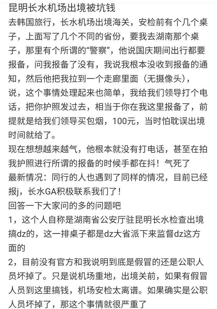 据此前该网友在帖子中叙述,自己10月6日计划从昆明长水机场前往韩国旅游,在机场出境海关进行安检之时,被自称是湖南省公安厅驻昆明长水机场工作人员的人士告知国庆期间出行需报备,当网友表示未收到报备通知之时,被其拉至一个未安装摄像头的走廊中,并称“这个事情处理起来也简单,我给领导打个电话,把你护照发过去,相当于你报备了,前提就是给我们领导买包烟,100元”。该网友表示,因为怕耽误出境时间,自己便支付了100元,事后还晒出了支付100元的截图证明此事。