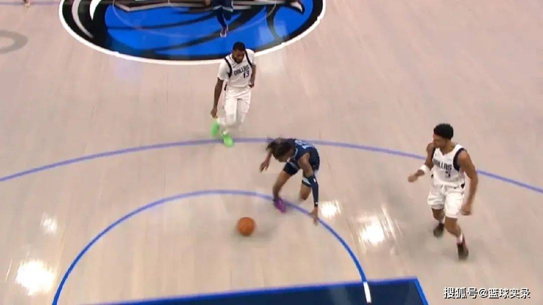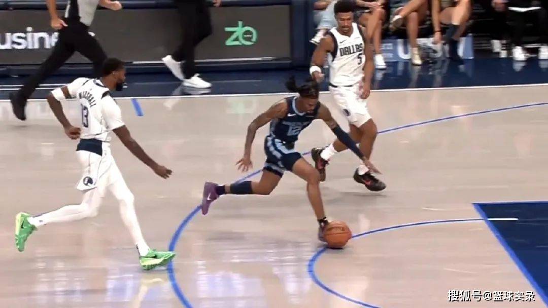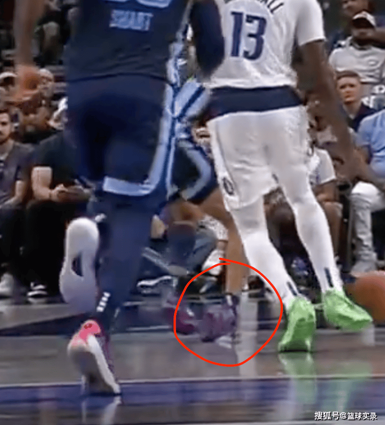 独行侠快攻,马绍尔击地传球,结果球砸在了回防的莫兰特脚上,慢动作看,这一球直接砸到莫兰特崴脚。