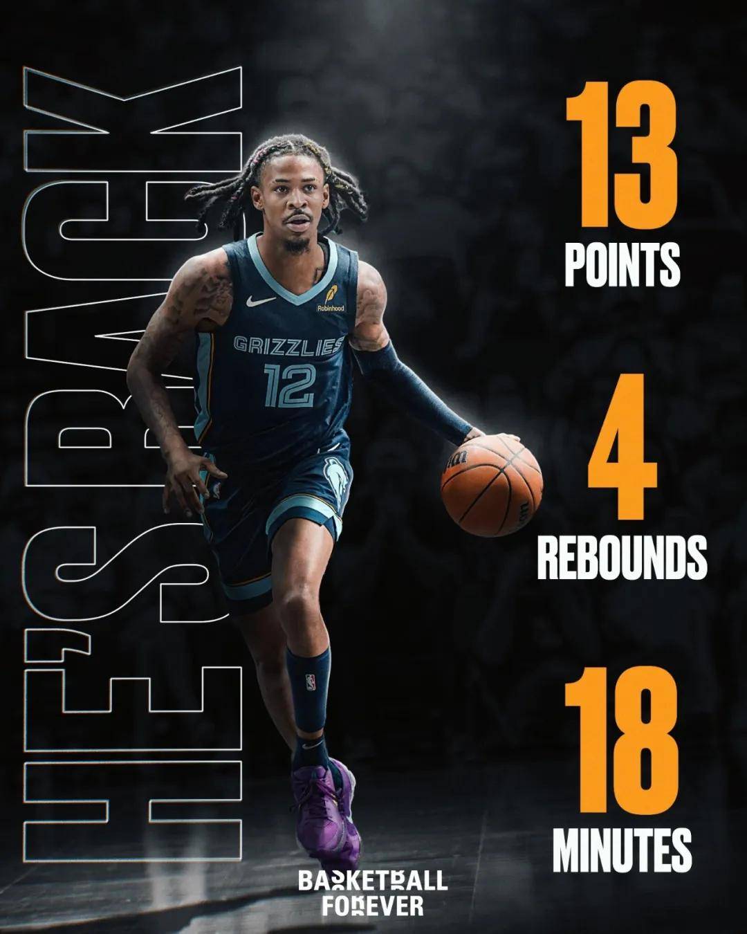 很快,莫兰特回到了更衣室,没过多久,莫兰特又重回赛场,但是在第三节的一个回合,莫兰特上演双手扣篮后, 落地后示意要下场休息 ,原以为情况不妙,但赛后莫兰特却表示没事,这只是季前赛。
