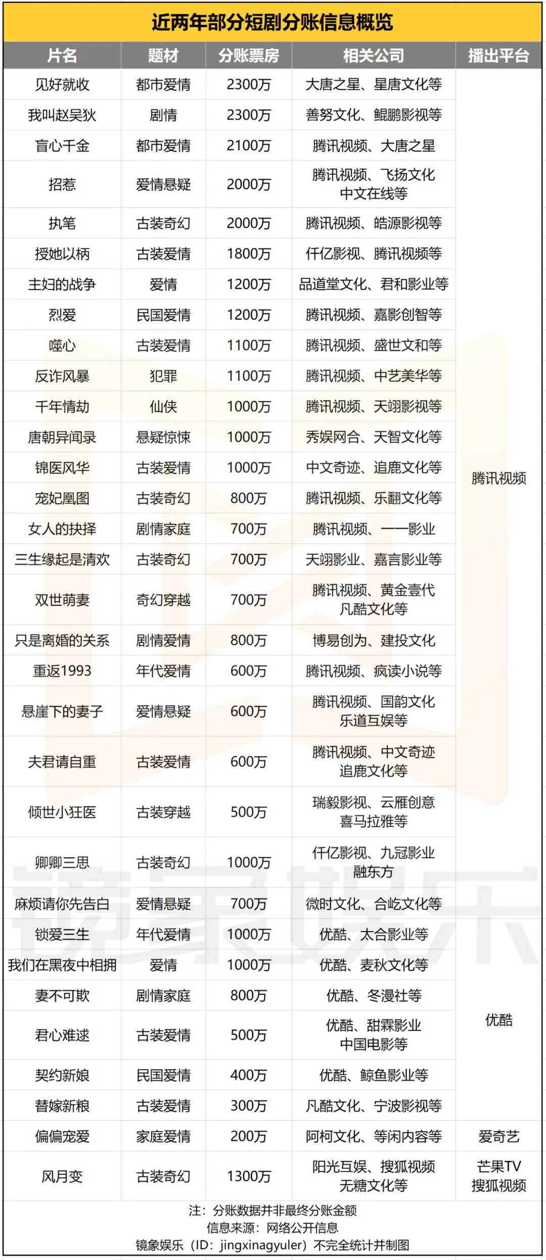 效果立竿见影,根据《2023腾讯视频微短剧年度报告》,2023年,腾讯视频微短剧分账总金额破4亿,年度内上新微短剧中共有3部破2000万,6部分账票房破1000万。此外,2024年至今,腾讯视频微短剧累计分账票房已突破2.6亿,且已有9个项目分账票房破千万,《见好就收》与《执笔》分账票房双双破2000万。