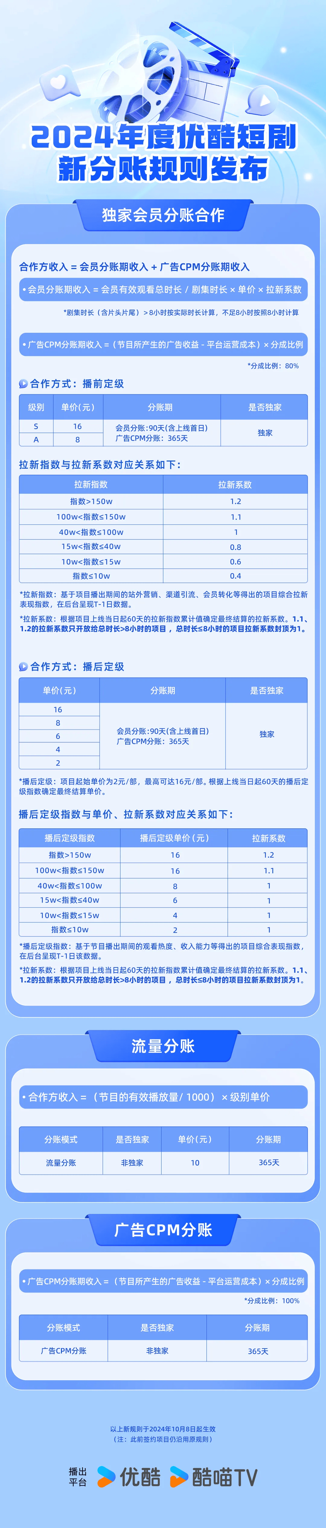 10月8日,优酷正式实行全新的短剧分账规则,其中,平台不仅抬高了短剧单集分账上限,还进一步引入拉新系数这一全新指标,平台围绕短剧的商业化探索持续细化。