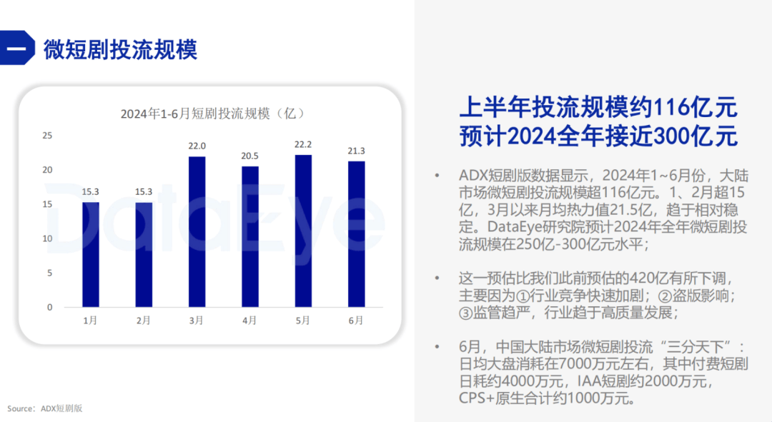 因此,目前短剧市场整体的投流力度很大,DataEye前不久发布的《2024上半年微短剧投流白皮书》数据显示,今年上半年,短剧投流规模约116亿元,预计全年在250亿-300亿元。甚至,不少短剧不惜将收入的90%用于投流。这也决定了当前短剧市场的收益大部分进入了渠道方的口袋,制作方可参与分成的比例甚至一度被压缩到10%以下。