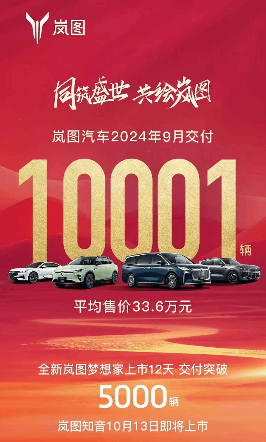 刚刚过去的9月,岚图汽车交付新车10001辆,实现首次交付破万,连续第五个月实现销量增长;1-9月,岚图汽车累计交付52548辆,同比大涨91%。