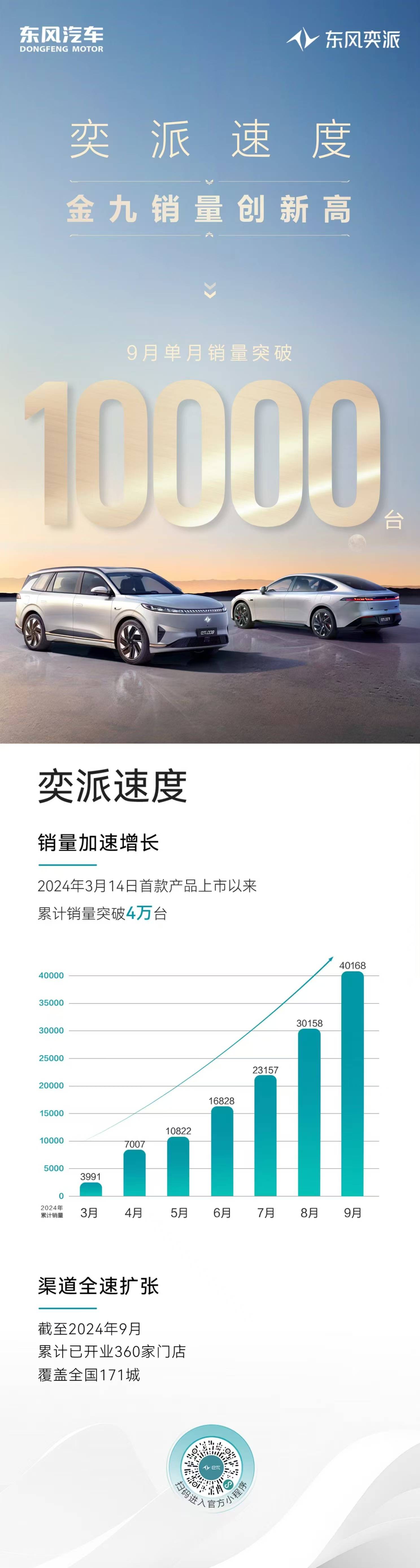 官方数据显示,9月东风奕派销售新车10010台,首次销量破万;截至9月,东风奕派累计销量40168台。其中,首款车型eπ007纯电版月销稳定在3000台,进入15-20万级中型纯电轿车销量TOP 2;eπ008上市后,成为25万元以下6/7座新能源SUV市场销量TOP3。