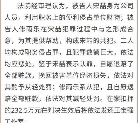 小妹儿回看了一下当年“轰动一时”的离婚案,宋喆因为职务侵占王宝强的资产,采用虚报演出、广告代言费的手段,侵占王宝强工作室演出、广告代言等业务款共计人民币232.5万元。