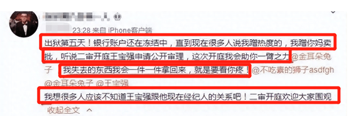 在这个账号里,账号的主人表示出狱第五天,银行账户还在冻结中,知道现在还有很多人说我蹭热度。接着一串脏字抒发情绪,紧接着他表示自己要把自己失去的都夺回来。在这条微博中,他还圈除了王宝强以及马蓉。