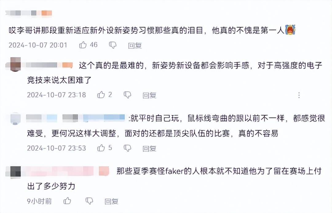 要知道别说是职业选手了,就连正常玩家要去改变操作习惯也是非常难的,又何况是使用新的鼠标跟键盘了。对此,很多网友也是惊呆了:“李哥讲那段重新适应新外设新姿势习惯那些真的泪目,他真的不愧是第一人”,“想过改变一切,但就是没想过退役”,“大飞每年的任务就是4号种子爬进世界赛,然后靠lpl把其他三个干掉,t1打lpl就跟勇士打开拓者似的,平时病的再严重,遇到lpl直接血脉觉醒”……