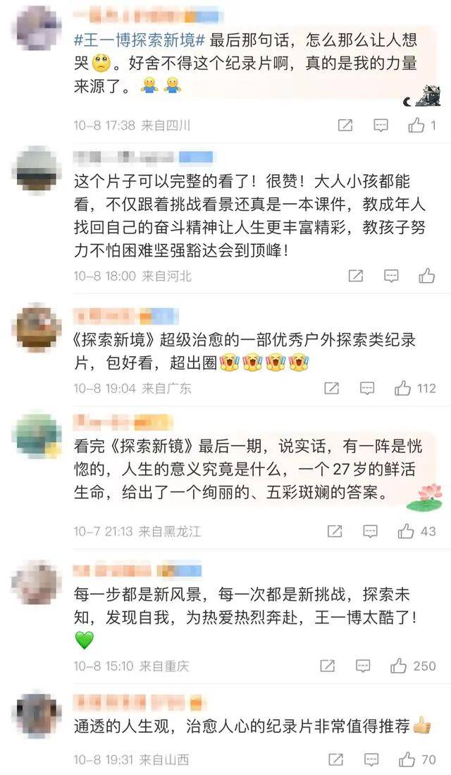截至收官,节目共斩获1351个微博热搜,相关微博话题阅读量超59亿,累计讨论量超5000万,其中#探索新境#主话题阅读量超14.4亿,网友们纷纷在社交平台上表示,“看王一博《探索新境》,也寻到了曾经的自己。”“《探索新境》是旷野之旅也是一场心灵之旅。”“很有意思的纪录片,不只是让观众领略到不易到达的目的地的风景,增长关于大自然和极限探险的知识,还跟随年轻易感的心一起思考人生的一些本质的问题。”