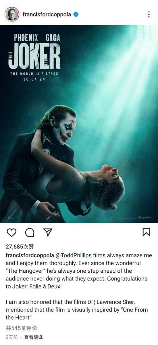 然而,同样受到低票房和低口碑困扰的电影导演却和观众有不一样的看法。这位新片收获了650万美元累计票房的著名导演发文力挺《小丑2》导演:“自从精彩的之后,他(托德·菲利普斯)总是走在观众前面,从不按他们的期望行事。祝贺《小丑2》!”