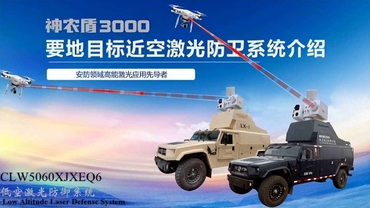 资料显示,这是一种可由越野车部署的低空反无人机防御系统,目前已知有两种型号,即神农盾-3000和神农盾-5000。该系统的激光器功率在10到20千瓦之间,雷达探测距离最远可达5公里。激光输出可直接摧毁1.5公里内目标,或对3公里内目标实施致盲,针对低小慢目标的每次毁伤时间约10秒。