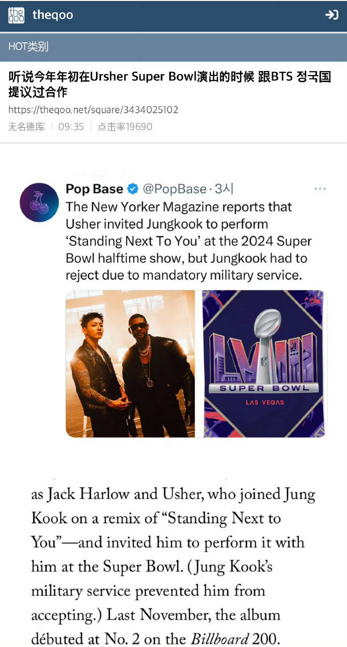 搜狐娱乐讯 近日,据New Yorker Magazine报道,田柾国曾被邀请在2024年超级碗中场秀上和usher一起表演《Standing Next To You》这首歌,但被hybe以田柾国义务兵役为由拒绝了邀请 。据悉田柾国在2023年12月与队员朴智旻一起入伍。