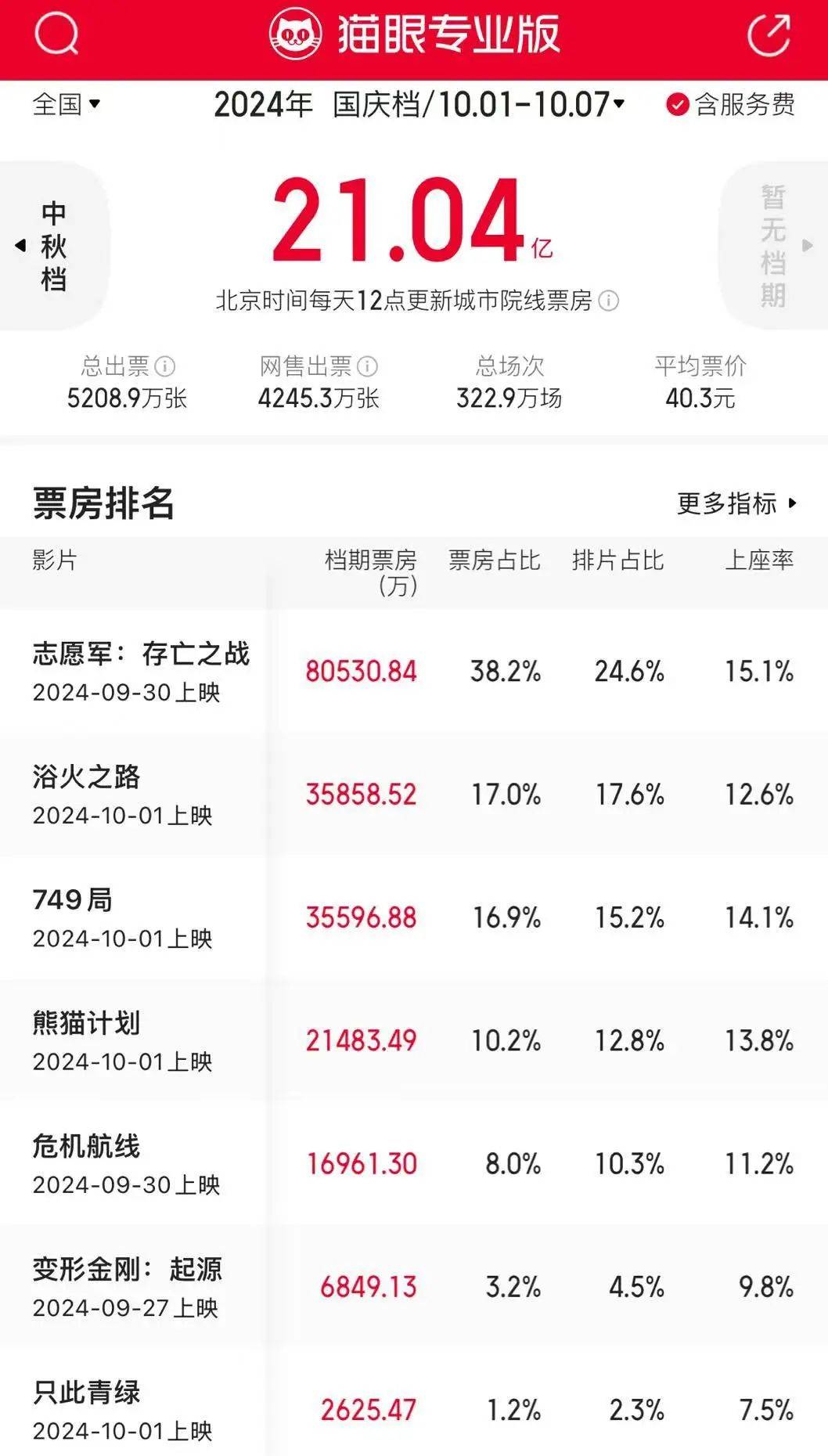 而今年国庆档整体的票房情况,也可以了解下,今年整个国庆档的总票房21亿,《志愿军:存亡之战》8亿票房遥遥领先,总票房预期大概14亿左右。