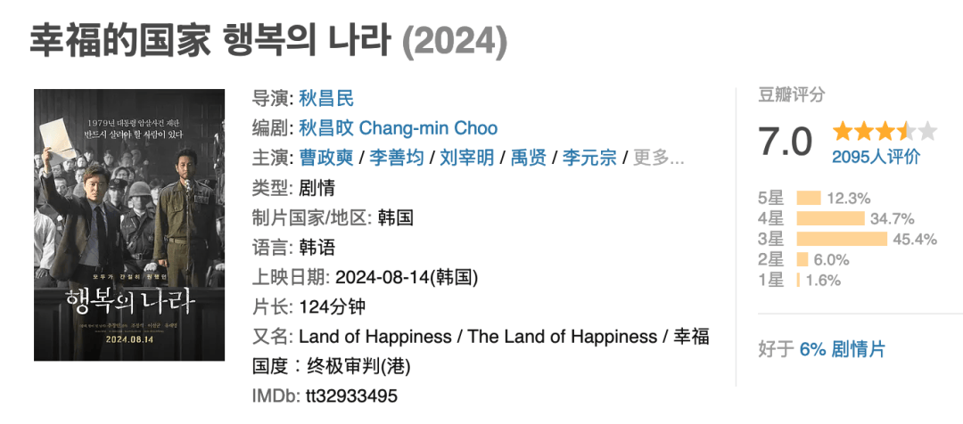 阵容非常强大,也算是近期韩国的大片了。从时间线上,刚好可以跟《南山的部长们》以及《首尔之春》连上,当然,影片质量比那两部还是要差一些。