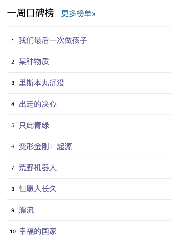 最后,还是例行附上一周豆瓣口碑榜的完整榜单: