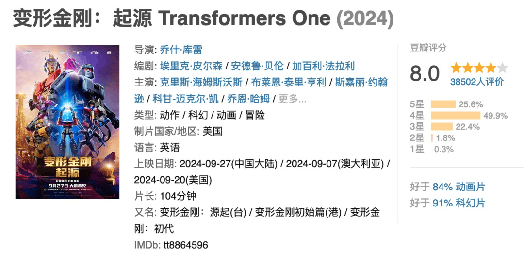 同样是前阵子的高分院线片,变形金刚的动画片,可以8.0分,也算是非常高分了。