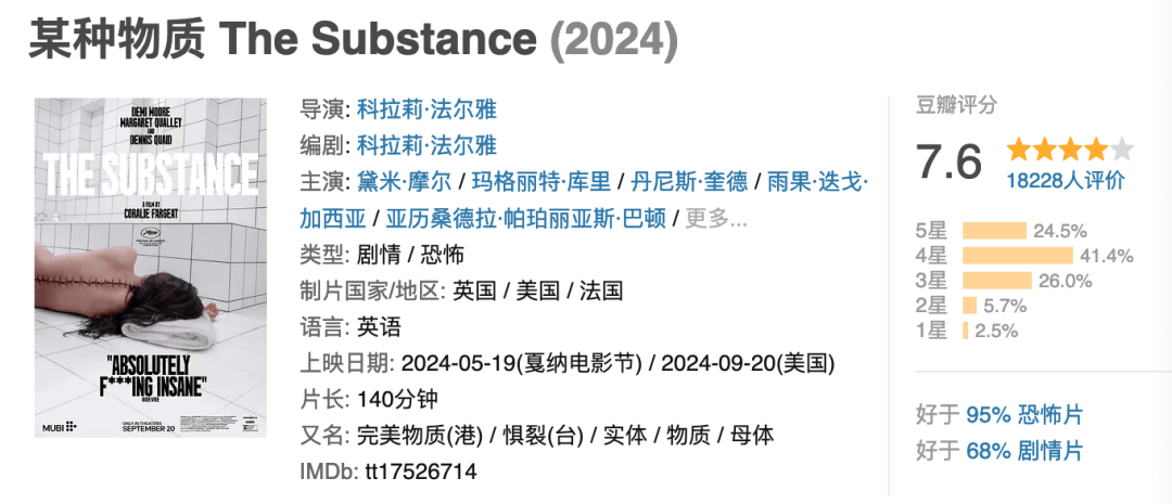 曾经红极一时的好莱坞巨星伊丽莎白(黛米·摩尔 Demi Moore 饰),无法面对自己老去的容颜,决定使用一种名为“完美物质”的黑市药物,透过注射药物的细胞复制物质,创造出更年轻、更好的另一个自己(玛格丽特·库里 Margaret Qualley 饰)。“年华老去”及“年轻貌美”的自己该如何共存?会是更强烈的容貌焦虑大战?还是要不断迎合大众对“美”的期待?一场自我身体主导权的争夺战即将上演……