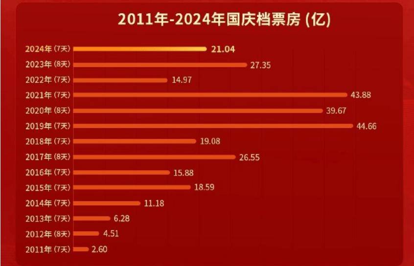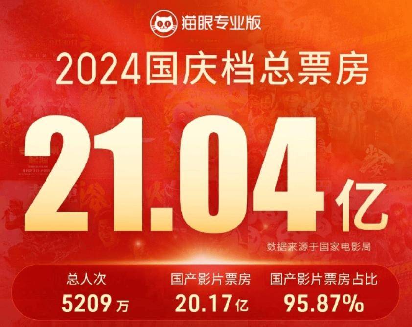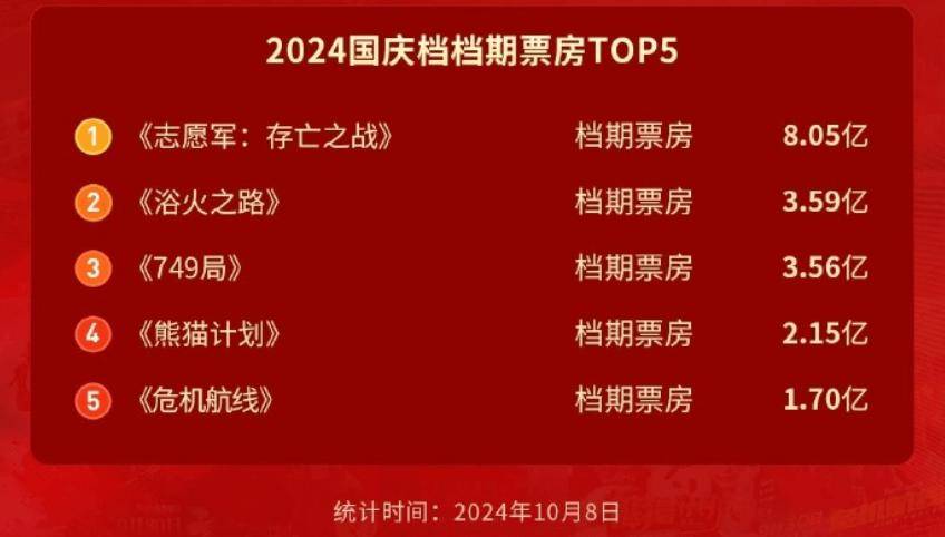 2024年国庆档,最终以 7天21.04亿的票房成绩收官。 《志愿军:存亡之战》以8.05亿的成绩拿下国庆档票房冠军,《浴火之路》和《749局》分别拿下亚军和季军。