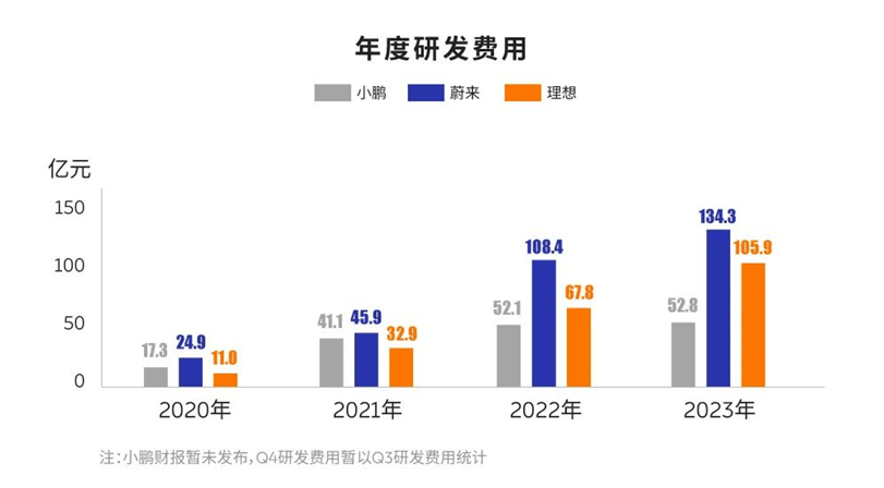 蔚来在过去几年的研发投入在新势力车企中一直处于领先状态。