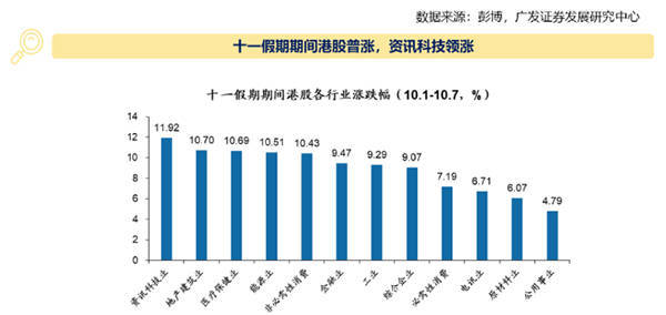 具体而言,十一期间,港股资讯科技业涨逾11%,大涨11.92%领跑其他行业。地产建筑业、医疗保健业、能源业、必需性消费等板块,涨幅均超过10%,分别上涨10.70%、10.69%、10.51%和10.43%。