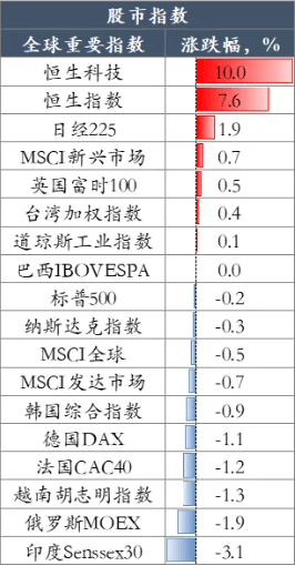 整体来看,“十一”期间(10月1日至10月4日)港股指数大幅上涨,全球其他市场则多数下跌。其中,恒生科技指数大涨10%,恒生指数涨7.6%。