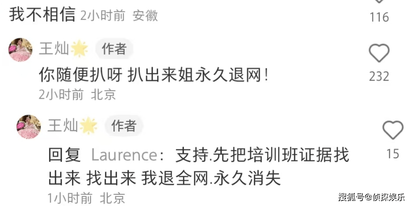 在王灿发布“套路”文案后,有网友跑到评论区再度提及了“名媛培训班”一事,并直言听说王灿和叶某是一个培训班出来的,对此,王灿直接回应“幼稚”。可见,这些质疑声已经完全影响不到王灿了。