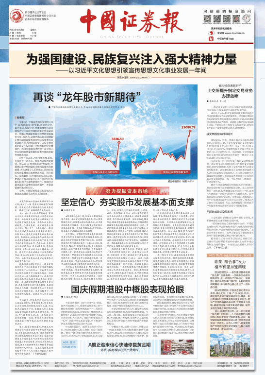 10月8日,中国证券报头版头条刊文《再谈“龙年股市新期待”》,文章提到证券市场出现V型反转,其主要原因当然是中央的政策改变了市场预期和大大增强了人们的信心。可以认为,市场在节前的点位上再上涨10%到20%,有着政策面、资金面和企业估值还相对较低的有效支持,而达到并站稳那个平台,多数股民和公募权益基金的基民才能够基本扭亏为盈。所以,开弓没有回头箭,这一仗既然出手就不能打败。当然,市场参与者的情绪性爆发和炒作可能会把市场推到更高的点位。