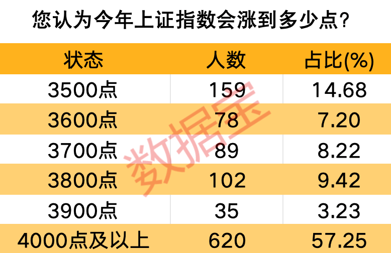 10月2日,证券时报旗下新媒体数据宝推出了一份关于本轮行情的小调查。最终,共计1083位热心读者参与了这次调查问卷活动。对于节后A股走势,有57.25%的受访者认为,今年上证指数将冲破4000点;另有14.68%的受访者相对比较谨慎,他们对A股年内站上3500点充满希望。