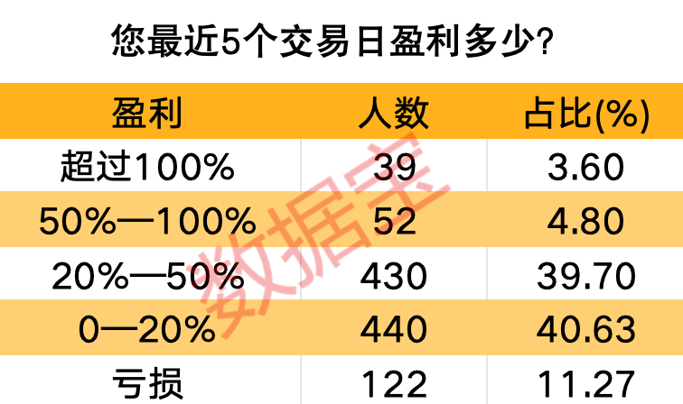 调查结果显示,在问题“最近5个交易日盈利情况”的回答中,近九成受访者表示赚到了钱。其中,有770位投资者的盈利在0—50%区间;赚到50%以上仅有不到9%的比例。