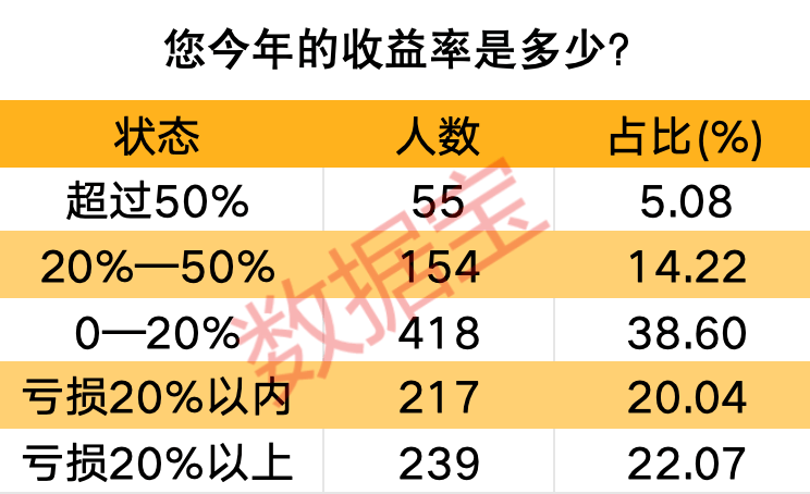 从今年整体收益率来看,58%的受访者表示,前三季度,在A股市场里获得了正收益。盈亏20%以内的投资者仍占据大多数,有近六成;大赚或巨亏的投资者数量比较有限,均在20%上下。