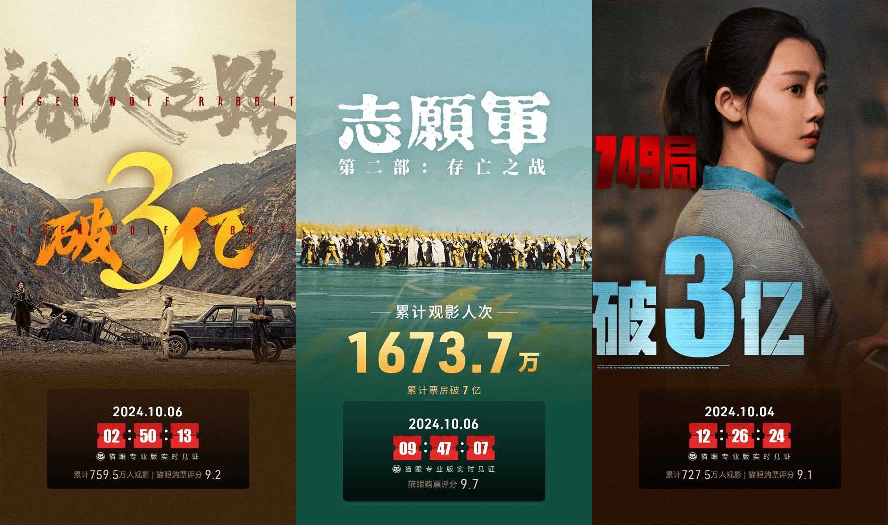 搜狐娱乐讯 据猫眼专业版数据,2024年国庆档7天(2024年10月1日至7日)全国电影总票房21.04亿元,观影人次5208.9万。《志愿军:存亡之战》成国庆档票房冠军,国庆档票房前五名影片分别为: